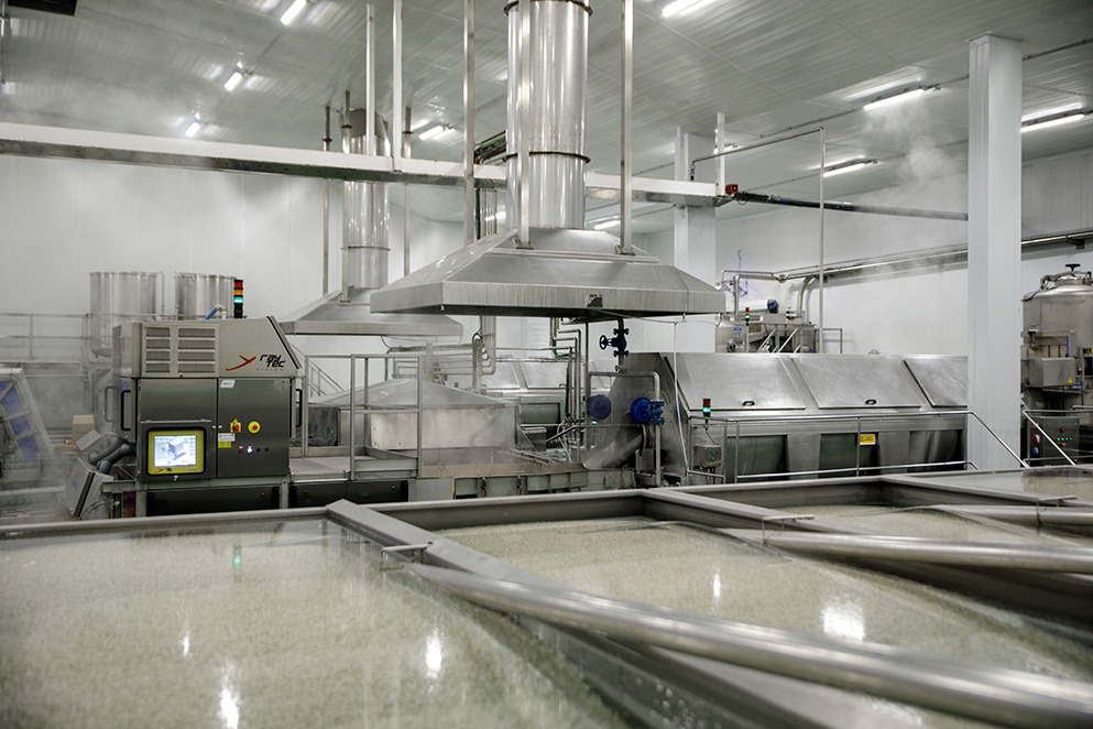 En la primera de las áreas de proceso se encuentra el despaletizador automático de vidrio. Aquí se incorporan todos los tarros que albergarán las legumbres cocidas. Una vez incorporados, dichos tarros pasan por un dispositivo de higiene, garantizando su absoluta limpieza e higiene. Los silos de remojo son la segunda zona. Todo el agua utilizada es descalcificada y sometida a un proceso de ósmosis inversa, que la transforma en un agua óptima tanto para la fabricación como para el producto preparado.